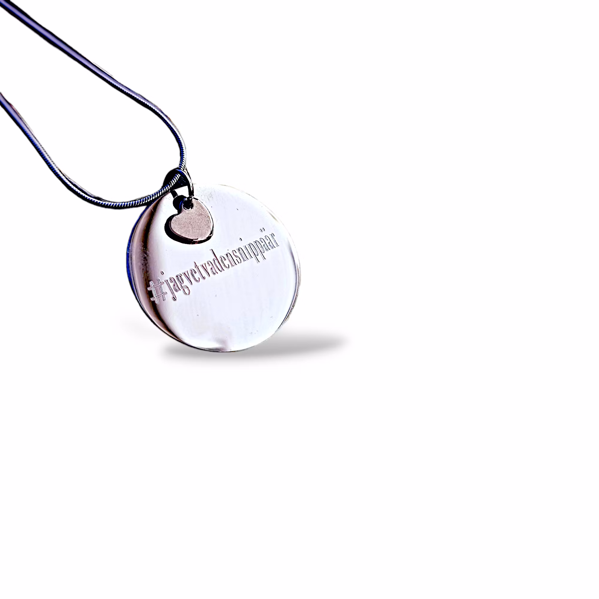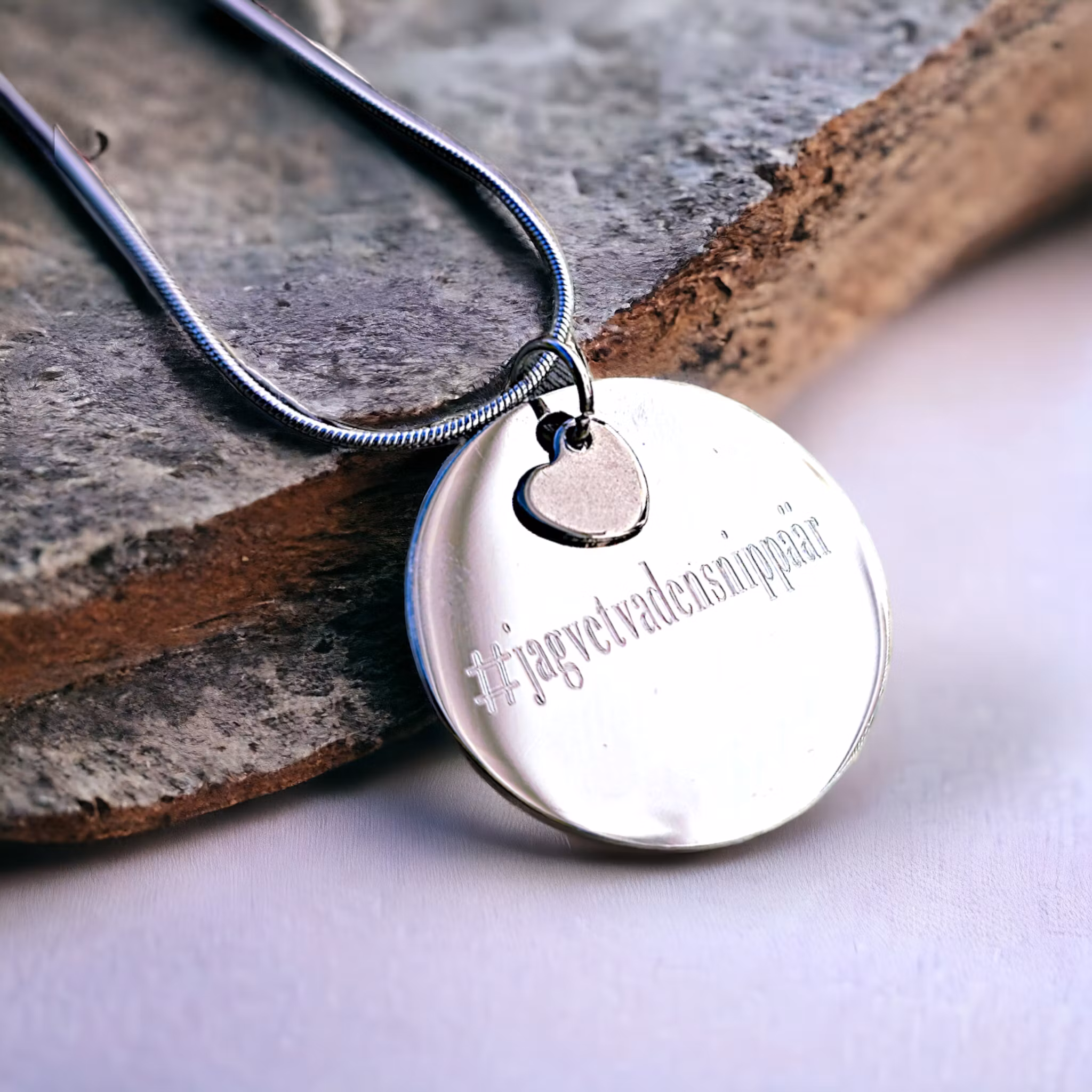 Halsbandet är en graverad platta i rostfritt stål 25 mm i texten Bodoni och ett litet hjärta. Kedjan finns i flera längder