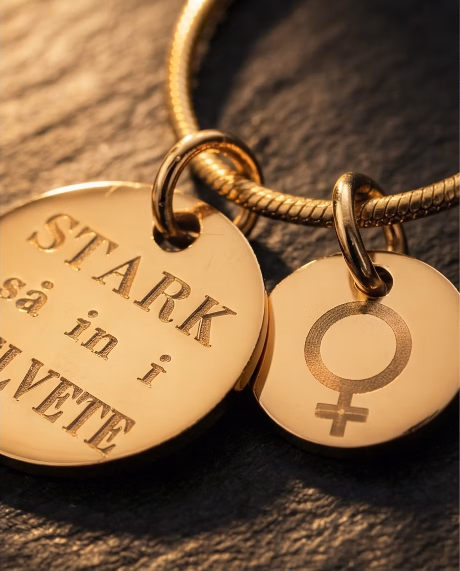 - Design: Smycket pryds med de inspirerande orden "STARK så in i HELVETE" och kompletteras av en liten tag med det ikoniska kvinnotecknet. Detta är mer än ett smycke - det är ett statement.