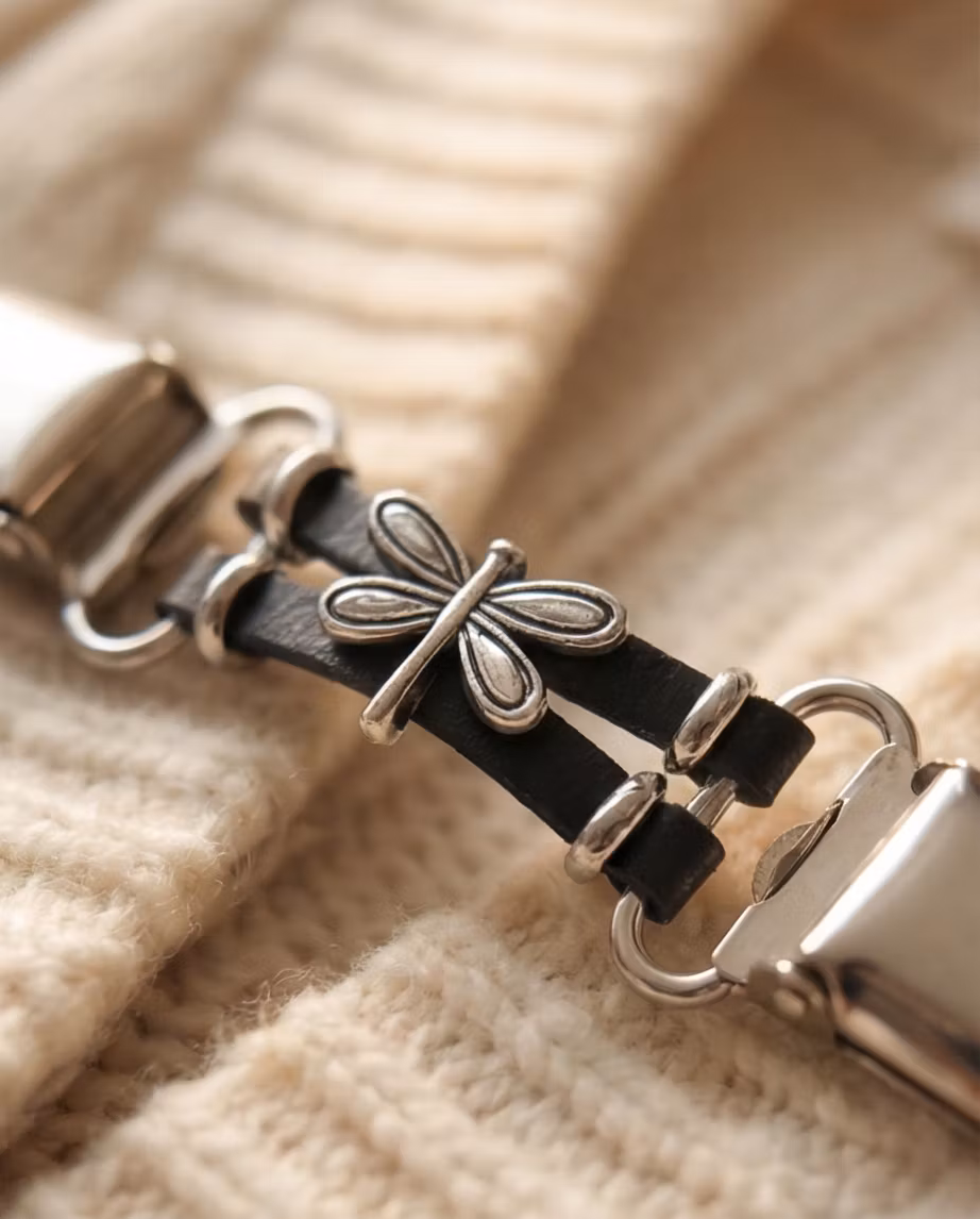 Cardigan clip / koftaspänne i äkta läder. Ett smycke med funktion! Till den knapplösa koftan eller sjalen. Äkta läder med unik design.