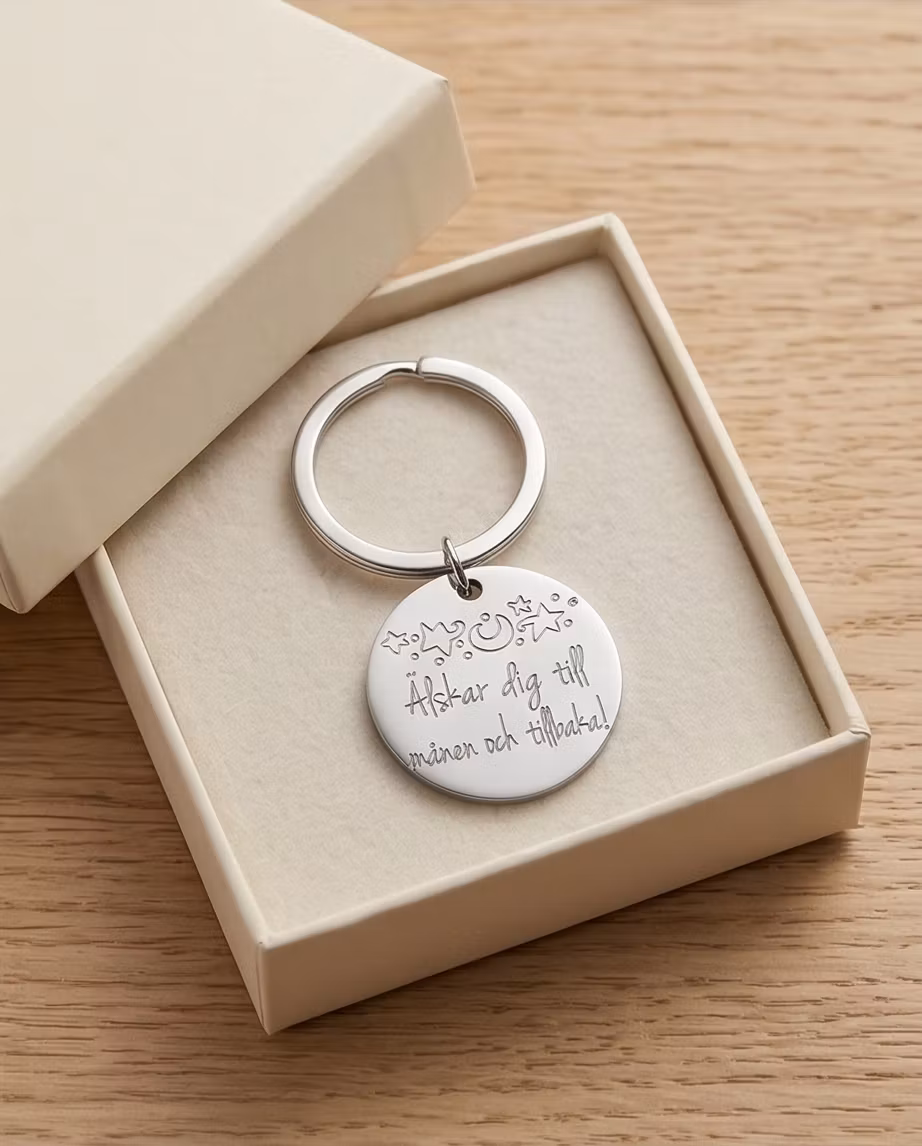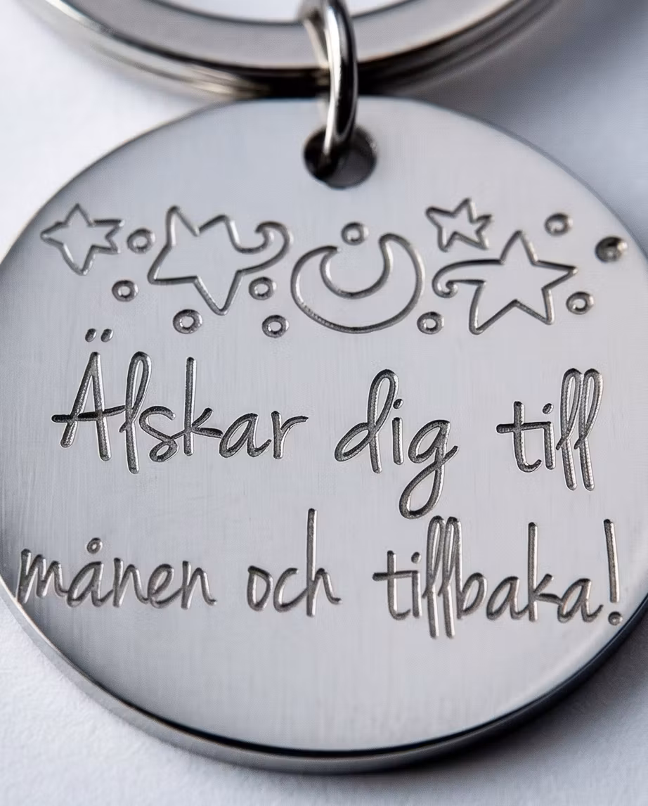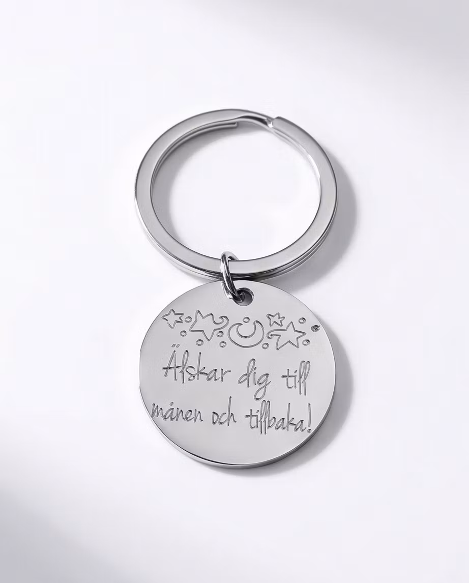 En nyckelring i rostfritt stål. Den stora taggen är 25 mm stor och har texten "Jag älskar dig till månen och tillbaka"