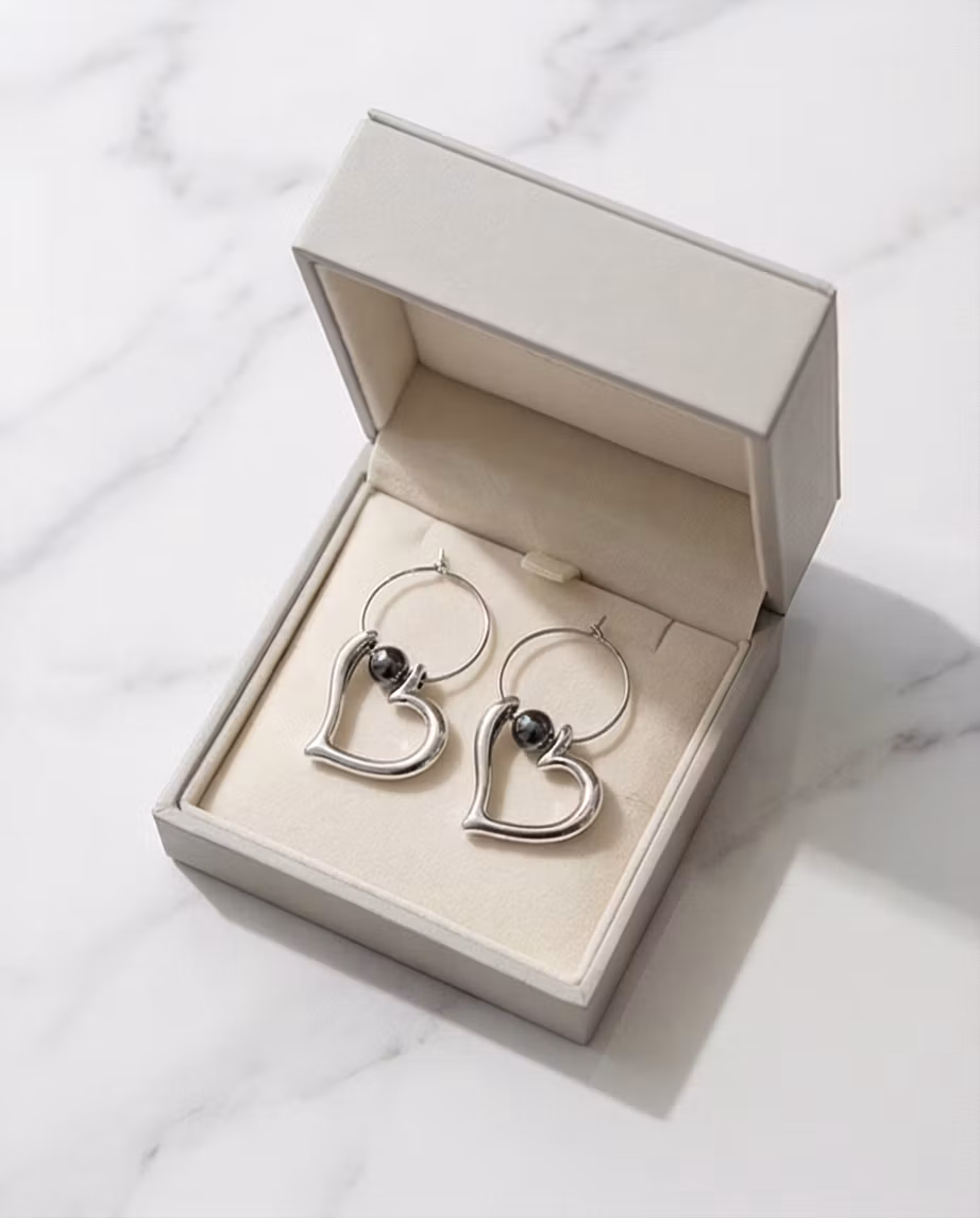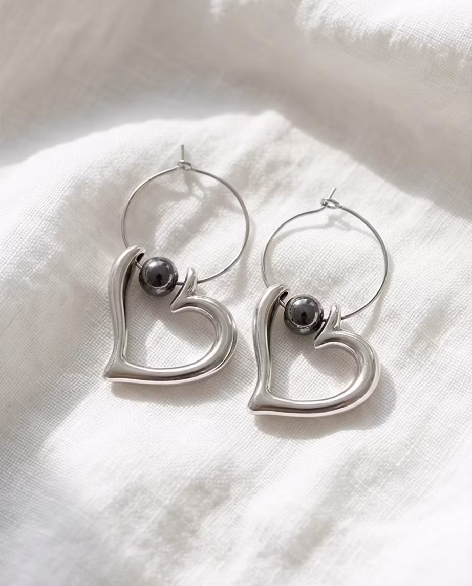 Hjärta med pärla 159:- I lager Lägg i korgen Information Örhängen i rostfritt stål. Ett öppet hjärta med en svart pärla. Creolen är 20 mm stor