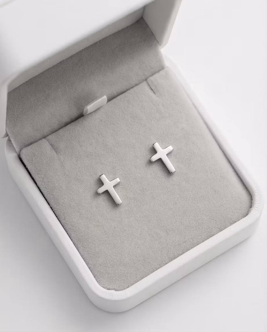 Små kors i rostfritt stål.  Säljs i par